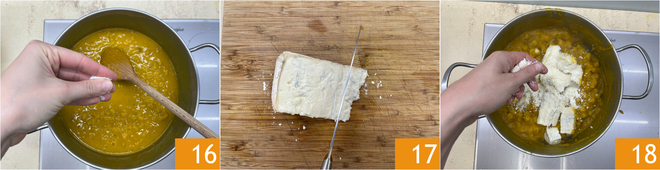 Añade agua cada vez que sea necesario y sala durante la cocción 16. Mientras tanto, corta el gorgonzola en cubitos 17 y añádelo a la cazuela con el fuego apagado junto con el Parmesano Reggiano rallado 18.