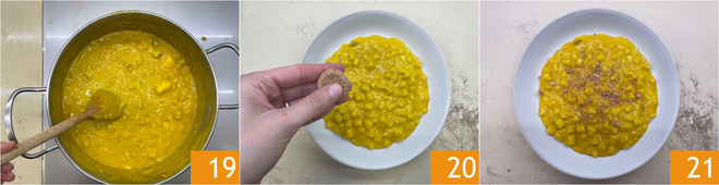 Mezcla bien hasta que todo esté bien amalgamado 19. Sirve desmenuzando sobre los platos los amaretti 20. La pasta con calabaza y gorgonzola está lista para ser degustada 21.