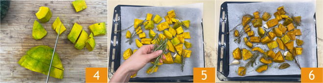 Corta la calabaza en cubos grandes 4. Transfiérela a una bandeja. Échale sal y añade ajo, tomillo, romero, laurel y un chorrito de aceite 5. Hornea y déjala cocinar durante unos 30 minutos en el horno estático precalentado a 180° 6.