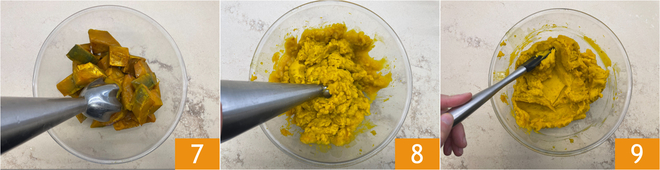 Una vez cocida la calabaza, eliminad los aromas y trituradla bien 7 con una batidora de mano 8 hasta obtener una crema 9.