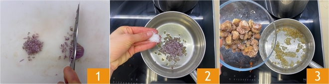 Para preparar la pasta con castañas y fondue de Parmigiano, primero limpia y pica finamente el chalote 1, luego ponlo en un cazo con un hilo de aceite y una pizca de sal 2; déjalo pochar suavemente a fuego bajo durante unos 5 minutos, removiendo de vez en cuando para que no se dore demasiado. Cuando esté suave y translúcido, añade las castañas precocidas 3, dorándolas bien junto con el chalote durante unos minutos.