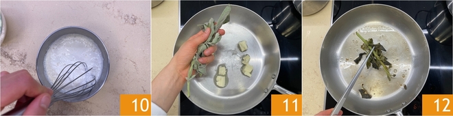 Mezcla con un batidor hasta que el queso esté completamente derretido y tengas una crema fluida y brillante 10. Mientras tanto, en una sartén amplia, derrite la mantequilla y añade las hojas de salvia 11; deja que adquiera sabor a fuego medio-bajo hasta que la mantequilla tome un tono avellana, removiendo a menudo para que no se queme. Cuando esté lista, retira la salvia 12.