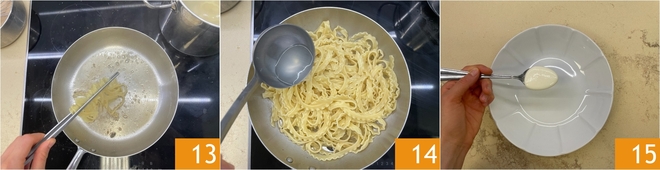 Escurre la pasta directamente en la sartén con la mantequilla 13 y empieza a mezclar añadiendo un cazo de agua de cocción para ligar bien el condimento 14, para obtener una consistencia cremosa y envolvente. Para emplatar, coloca un par de cucharadas de fondue de Parmigiano en el fondo del plato 15.