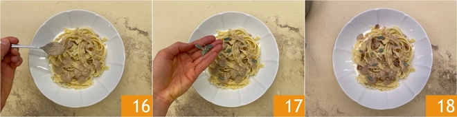 Coloca encima la pasta y completa con unas cucharadas de salsa de castañas 16. Termina el plato con algunas hojas de salvia fresca 17 y las castañas precocidas desmenuzadas reservadas. ¡Tu pasta con castañas y fondue de Parmigiano caliente está lista para ser servida 18!