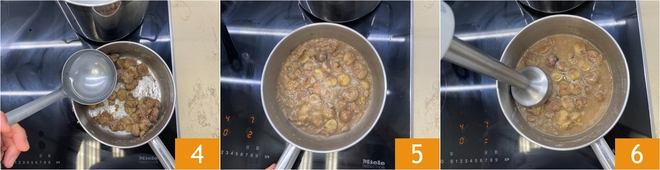 Reserva algunas castañas para la decoración final, mientras que las otras báñalas con un par de cazos de agua caliente 4, sala ligeramente y déjalas cocer otros 5 minutos, hasta que se ablanden 5. En este punto, tritura todo con una batidora de inmersión 6.