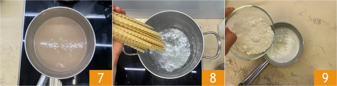Deberás obtener una crema lisa y aterciopelada 7, así que resérvala. Mientras tanto, lleva a ebullición una olla llena de agua salada y cuece la pasta al dente 8. Mientras, dedícate a la fondue: calienta la nata en un cazo sin llevarla a ebullición. Una vez caliente, apaga el fuego y añade el Parmigiano Reggiano rallado 9.