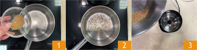 Para preparar la pasta con coliflor amarillo y azafrán, primero tuesta las semillas de mostaza en una sartén caliente durante unos minutos 1, hasta que empiecen a crepitar y liberar todo su aroma 2. Una vez doradas, déjalas enfriar y transfiérelas a la licuadora para especias o café 3, luego tritúralas hasta obtener un polvo fino y aromático.
