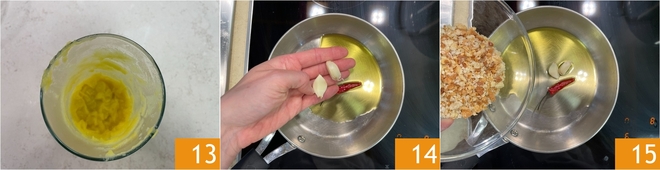 Debes obtener una crema lisa, suave y aterciopelada 13. En otra sartén, calienta un chorrito de aceite con los dientes de ajo y la guindilla 14. Deja que se impregne a fuego lento, luego añade el pan rallado 15.