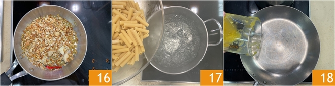 Tuesta el pan rallado hasta que esté dorado y crujiente 16. Resérvalo: servirá para dar crocantez al plato. Mientras tanto, cuece los sedanes, si quieres puedes usar el agua de cocción del coliflor llevada a ebullición 17, escurriéndolos 2 minutos antes del tiempo indicado. Transfiere la crema de coliflor a una sartén 18.