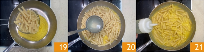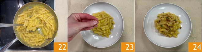 Escurre aquí los sedanes 19 y completa la cocción añadiendo, si es necesario, un cucharón de agua de cocción para mantenerlos cremosos 20. Apaga el fuego y remueve con un chorrito de aceite de oliva virgen extra 21.