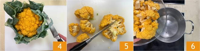 Dedícate ahora al coliflor: elimina las hojas externas 5 y corta los ramilletes 4. Hiérvelos en agua salada hirviendo durante unos 8-10 minutos 6; deben quedar tiernos pero todavía compactos.
