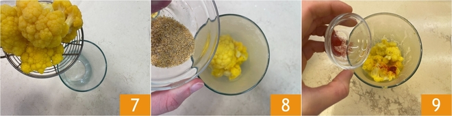 Escurre los ramilletes con una espumadera y recógelos en un vaso alto 7, luego añade las semillas de mostaza trituradas 8 y el azafrán 9.