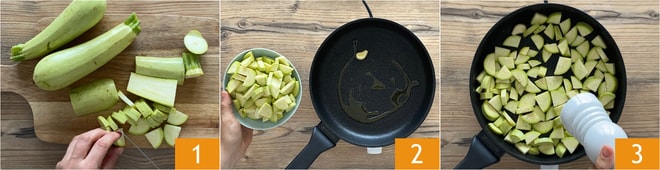 Para preparar la pasta con crema de calabacines y burrata, primero lava y recorta los calabacines, luego córtalos en triángulos 1. En una sartén antiadherente sofríe el diente de ajo en el aceite, luego añade los calabacines 2, sala y pimienta 3.
