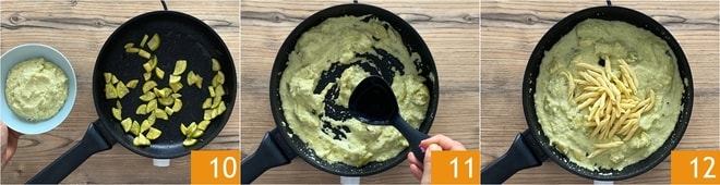 Vierte la crema en la sartén con los calabacines restantes 10, añade un cazo del agua de cocción de la pasta y remueve bien 11. Transcurrido el tiempo de cocción, escurre la pasta directamente en la sartén 12.