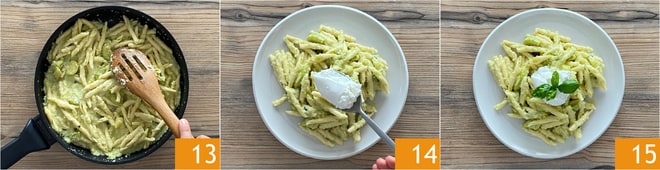 Mezcla para integrar la pasta al condimento 13. Completa el plato con una cucharada de burrata cruda 14 y sirve tu pasta con crema de calabacines y burrata 15!