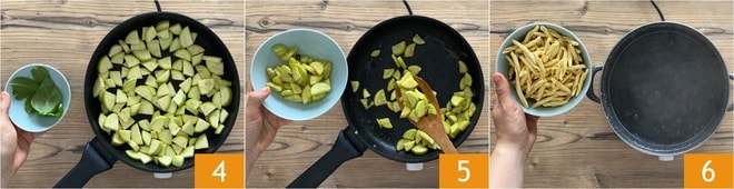 Agrega también las hojas de albahaca y menta desgarradas con las manos 4 y cocina los calabacines a fuego moderado, con la tapa, removiendo de vez en cuando. Una vez cocidos, retira la mitad de los calabacines y deja el resto en la sartén 5. Mientras tanto, lleva a ebullición una olla con agua salada y cocina la pasta el tiempo indicado 6.