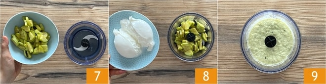 Transfiere los calabacines apartados a una batidora 7, añade la mitad de la burrata 8 y tritura hasta obtener una crema homogénea 9.