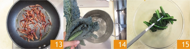 Cocina hasta que esté bien dorado, luego apaga el fuego 13. Escalda las hojas de col rizada en agua hirviendo y salada durante 3 minutos 14, luego escúrrelas con unas pinzas 15. No tires el agua, servirá para cocinar la pasta.