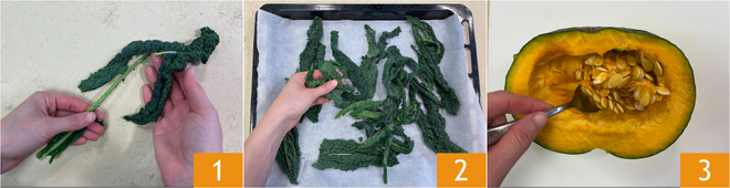 Para preparar la pasta con crema de calabaza y taleggio, comienza con la col negra: separa las hojas de los tallos 1, luego colócalas en una bandeja forrada con papel de horno, separándolas ligeramente entre sí 2. Cocina en horno precalentado con ventilador a 170° durante 20 minutos. Mientras tanto, ocúpate de la calabaza: límpiala de semillas y filamentos internos 3.