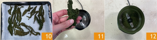 En este punto, la col negra estará cocida 10, las hojas deben estar secas y crujientes. Colócalas en un molinillo de especias 11 y tritura para obtener un polvo 12.
