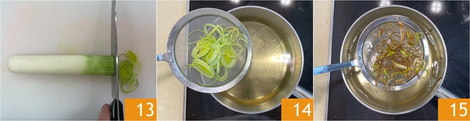 Pasa al puerro: limpia el puerro y córtalo finamente 13. Calienta el aceite de semillas hasta una temperatura de 180° y fríe las rodajas de puerro 14 durante aproximadamente un minuto, hasta que estén doradas. Escurre 15 y transfiere a papel absorbente o para fritos.