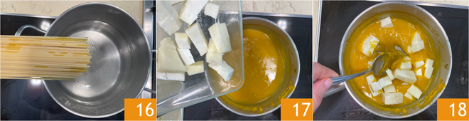 Ahora cocina los espaguetis en agua hirviendo con sal 16. Mientras tanto, calienta la crema de calabaza en un cazo, luego añade el taleggio en trozos 17 y mezcla a fuego lento para que se derrita completamente 18.