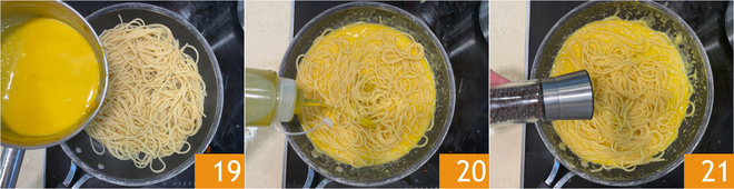 Escurre la pasta un minuto antes del final del tiempo de cocción y transfiérela a una sartén grande con un poco de agua de cocción, luego añade la crema de calabaza y taleggio 19 y mezcla bien para amalgamar. Finalmente, mezcla con un hilo de aceite 20 y una pizca de pimienta 21.