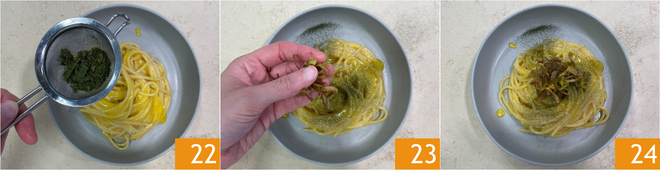 Emplata y adorna con el polvo de col negra, ayudándote con un colador 22, y el puerro frito 23. ¡Tu pasta con crema de calabaza y taleggio está lista para ser servida 24!