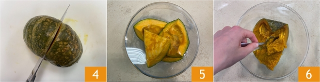 Córtala en 4 partes 4, luego ponla en un bol y cubre con film 5. Cocina en microondas durante 5 minutos a la máxima temperatura. Una vez cocida, retira la pulpa con una cuchara 6.