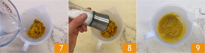 Transfiere la pulpa a un recipiente, luego añade el agua 7 y la sal 8. Tritura con una batidora de mano para obtener una crema lisa y homogénea 9 y reserva.