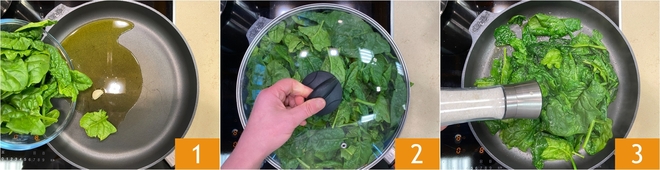 Para preparar la pasta con crema de espinacas y panceta crujiente, como primer paso, sofreíd el diente de ajo junto con el aceite en una sartén grande. Luego agregad las espinacas 1 y cubrid con una tapa 2. Cocinad durante unos 5 minutos y después salpimentad 3.