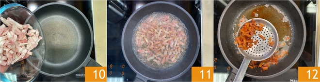 Mientras la pasta se cuece, ocupáos de la panceta: cortadla en tiras y luego ponedla en una sartén caliente 11. Cocinad a fuego medio sin añadir grasa 11. Cuando esté bien dorada, escurridla 12.