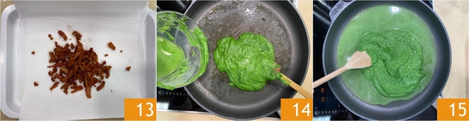 Pasad la panceta a una bandeja con papel de cocina 13. Verted la crema de espinacas en la misma sartén que habéis usado para cocinar las espinacas 14. Agregad un cazo de agua de cocción de la pasta y mezclad para diluirla 15.