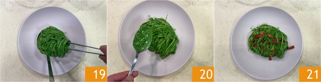 Escurrid la pasta al dente y pasadla directamente al condimento 16. Si es necesario, añadid más agua del cazo 17 y saltead bien todo 18.