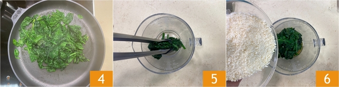 Continuad la cocción unos minutos más sin la tapa para que se evapore bien el líquido 4, luego dejad enfriar un poco. Transferid las espinacas al vaso de una batidora 5 y añadid el Parmigiano Reggiano rallado 6.