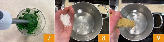Batid con una batidora de mano hasta obtener una crema lisa y homogénea 7. Reservad. Poned al fuego una olla llena de agua para cocinar la pasta y añadid sal 8; en cuanto hierva, sumergid los espaguetis 9.