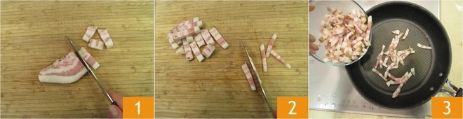 Para preparar la pasta con crema de guisantes y guanciale, comenzad precisamente por este último. Cortadlo primero en rodajas 1 y luego de estas sacad tiras finas 2. Después, verted el guanciale en una sartén caliente 3,
