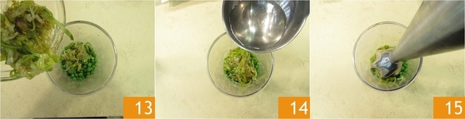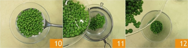 Usando una espumadera, retirad los guisantes y sumergidlos en un bol con agua muy fría 10. Reservad la olla con el agua, servirá para la cocción de la pasta. Escurrid nuevamente los guisantes 11; reservad 1/3 y verted los demás en un recipiente alto 12.
