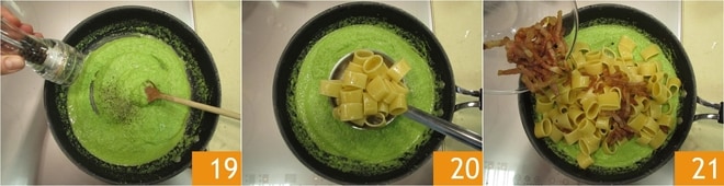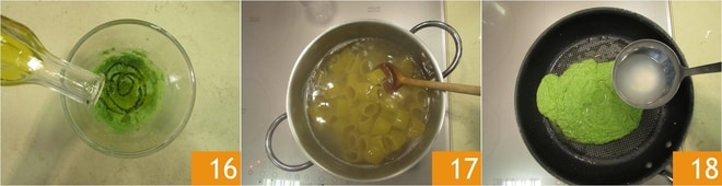 Añadid a la crema un hilo de aceite de oliva virgen extra 16, mezclad y reservad. Llevad nuevamente el agua a ebullición y verted la pasta dentro 17. Mientras tanto, verted la crema de guisantes y puerro en la sartén, añadid un cucharón de agua de cocción 18,