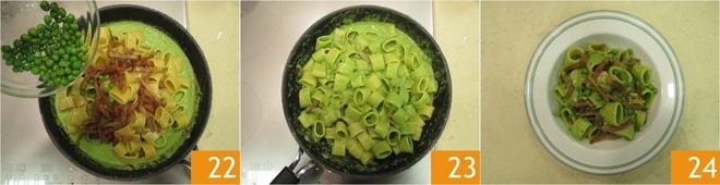 Añadid los guisantes restantes 22 y saltead la pasta durante un par de minutos a fuego medio 23. Emplated y decorad con el guanciale crujiente 24, ¡luego servidla inmediatamente!