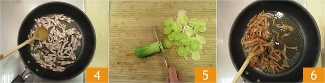 y dejadlo cocinar durante 5 minutos a fuego medio mezclando de vez en cuando 4. Mientras tanto, eliminad la parte exterior del puerro y cortadlo en rodajas 5. Cuando el guanciale esté bien dorado, escurridlo 6.