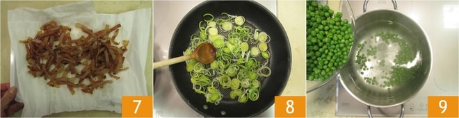 Pasadlo a un plato cubierto con papel absorbente 7 y reservadlo. En la misma sartén, verted el puerro cortado en rodajas 8 y cocinadlo a fuego medio durante unos 5 minutos hasta que se ponga blando y dorado. Poned a calentar una olla llena de agua, salada al gusto, que servirá para la cocción de la pasta. Tan pronto como comience a hervir, verted los guisantes dentro 9 y dejadlos cocinar durante un par de minutos.