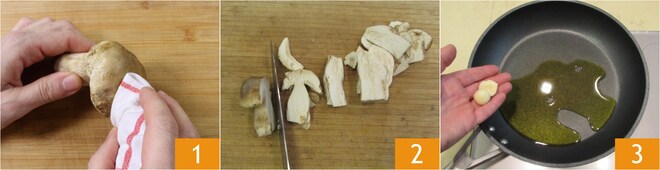 Para preparar la pasta con crema de Parmigiano y setas porcini, primero limpia las setas: raspa suavemente el tallo para quitar la parte terrosa, luego elimina los residuos con la ayuda de un paño húmedo y un pincel 1. Corta las setas a lo largo en rodajas de aproximadamente medio centímetro de grosor 2. Pon una olla con agua al fuego para cocinar la pasta y calienta en una sartén una generosa cantidad de aceite con 2 dientes de ajo 3.