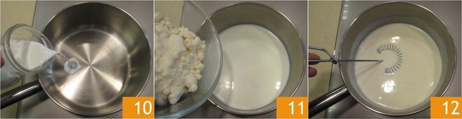 Mientras tanto, prepara la crema de Parmigiano Reggiano DOP: calienta la leche en un cazo 10, luego añade el Parmigiano Reggiano DOP rallado 11 y una pizca de pimienta. Remueve a fuego lento hasta obtener una consistencia homogénea 12.