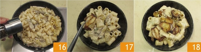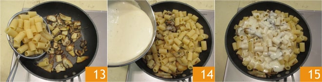 Escurre la pasta al dente directamente en la sartén con las setas 13 y saltea todo junto, luego añade la crema de Parmigiano Reggiano DOP con el fuego apagado 14 y mezcla bien 15. Si es necesario, puedes añadir un poco de agua de cocción de la pasta.
