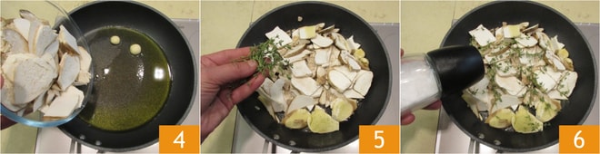 Añade los porcini 4, luego condimenta con el tomillo 5, sal 6 y pimienta. Saltea a fuego medio-alto durante 6-8 minutos, removiendo a menudo para que no se quemen.