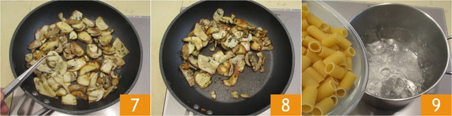 Una vez cocidos, elimina el ajo 7 y guarda algunas setas para la decoración 8. En este punto, el agua habrá llegado a ebullición, así que sala y añade las mezze maniche 9.