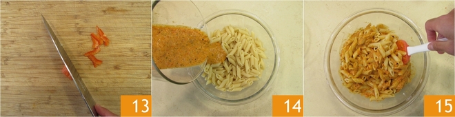 Toma el pimiento reservado y córtalo finamente 13. Vierte en el bol con la pasta la crema de pimientos 14 y mezcla 15.