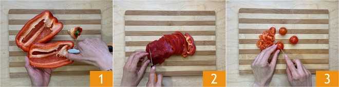 Para preparar la pasta con crema de pimientos y ricotta, primero lavad los pimientos, eliminad la parte superior con el tallo, divididlos a la mitad y extraed las semillas internas, luego cortadlos en tiras 2. Lavate y cortad a la mitad los tomates cherry 3.