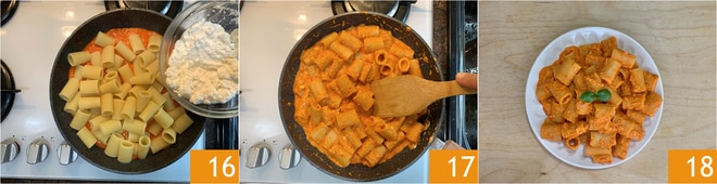 Añadid la ricotta 16 y saltead todo el tiempo justo para amalgamar el condimento 17. Servid la pasta con crema de pimientos y ricotta bien caliente 18.